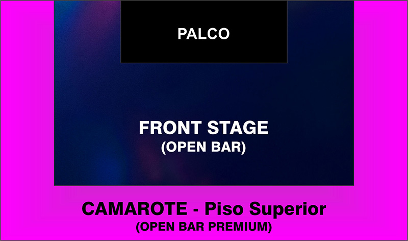 - FRONT-STAGE OPEN BAR: (Área na frente do palco com Bares, banheiros e serviços exclusivos.) OPEN BAR de Cerveja, Vodka Premium, Refrigerante, Sucos e Água.
